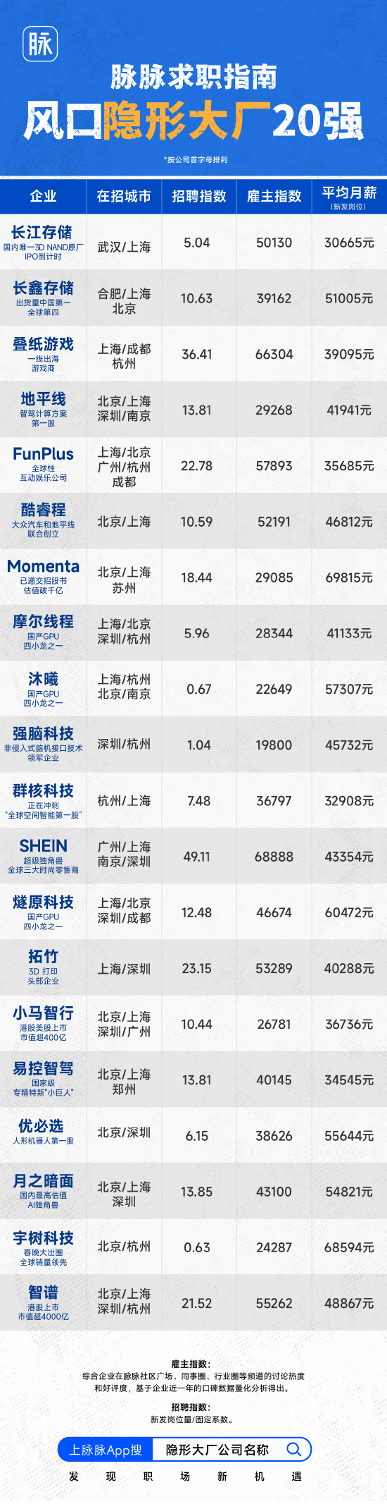 值得关注的是,脉脉还从80家“隐形大厂”中,依据岗位增幅、雇主口碑和新发岗位平均薪资,进一步精选出20家高速成长的企业,形成“隐形大厂20强”。这些企业集中分布于AI、机器人、智能驾驶、芯片等热门风口赛道,既代表着当前科技产业最活跃的方向,也承载着未来更大的增长潜力。
